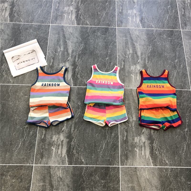 ◆新作◆ 「クリアランス」夏の男の子の綿のベストスーツバージョンコットンノースリーブTシャツショートパンツストライプ虹虹 サマー 夏物 ショーツ ブルマー オシャレ キッズ mi062952360