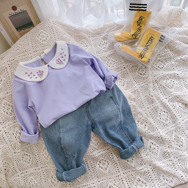 ◆新作◆ 女の子Tシャツ2020新しい子供たちの刺繍ラペル長袖ボトムスシャツ赤ちゃん無地シャツ人形の襟の子供服 ロング ソリッドカラー オシャレ キッズ mi066363194