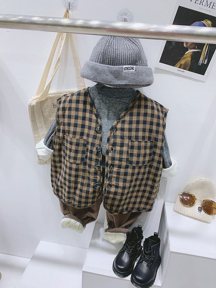 レトロなアクセント子供用チェック柄ベストジャケット男の子と秋と冬 オータム 秋物 ウィンター 冬物 SNSで話題 KIDS男の子 KIDS女の子 韓国ファッション 男の子ママ 女の子ママ 海外キッズファッション 親子コーデ 今日の服 プチプラ mi0647774882847