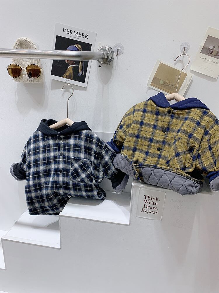 ゆったりとしたチェック柄のキルティングフード付きジャケットのカスタムボーイズバージョン、子供用ウエスタンスタイルのジャケット、ボーイカーディガンの厚い冬服 ウィンター 冬物 mi0672828967490