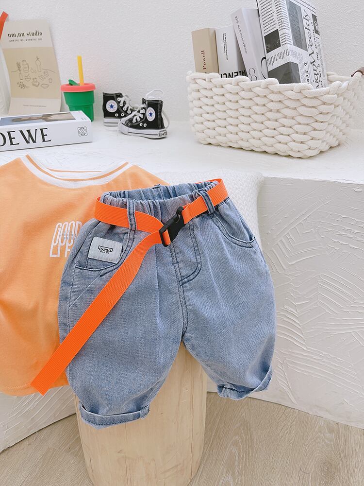 サマーブルー薄手ジーンズ カジュアルベルト プリントパンツ 夏物 ハーネス mi0623083967653