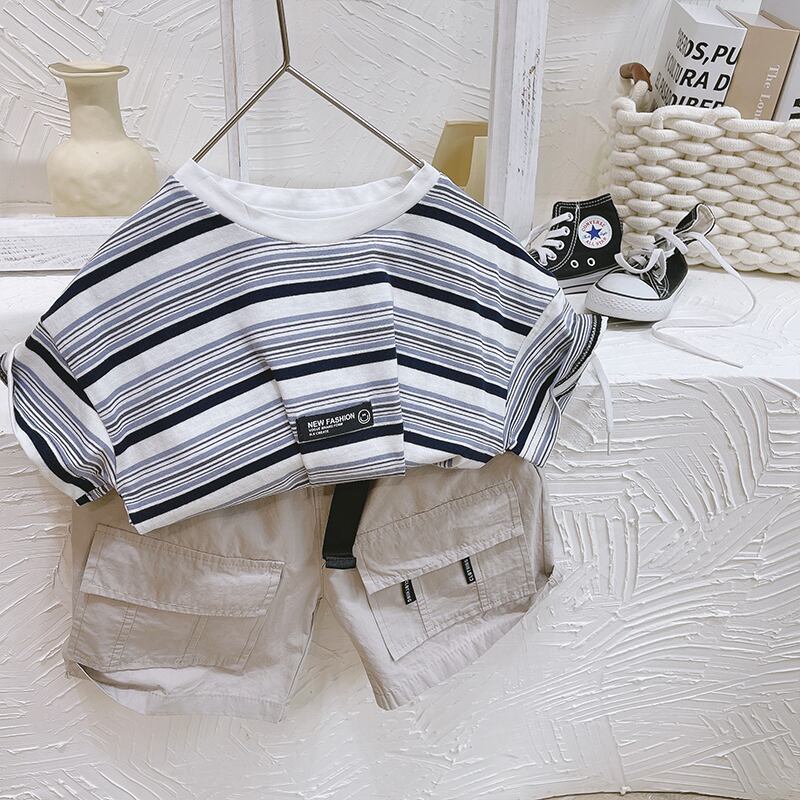 スタイルストライプシャツプルオーバー ラウンドネックルーズカジュアル コットン キッズ Oネック Tシャツ mi0635375122710