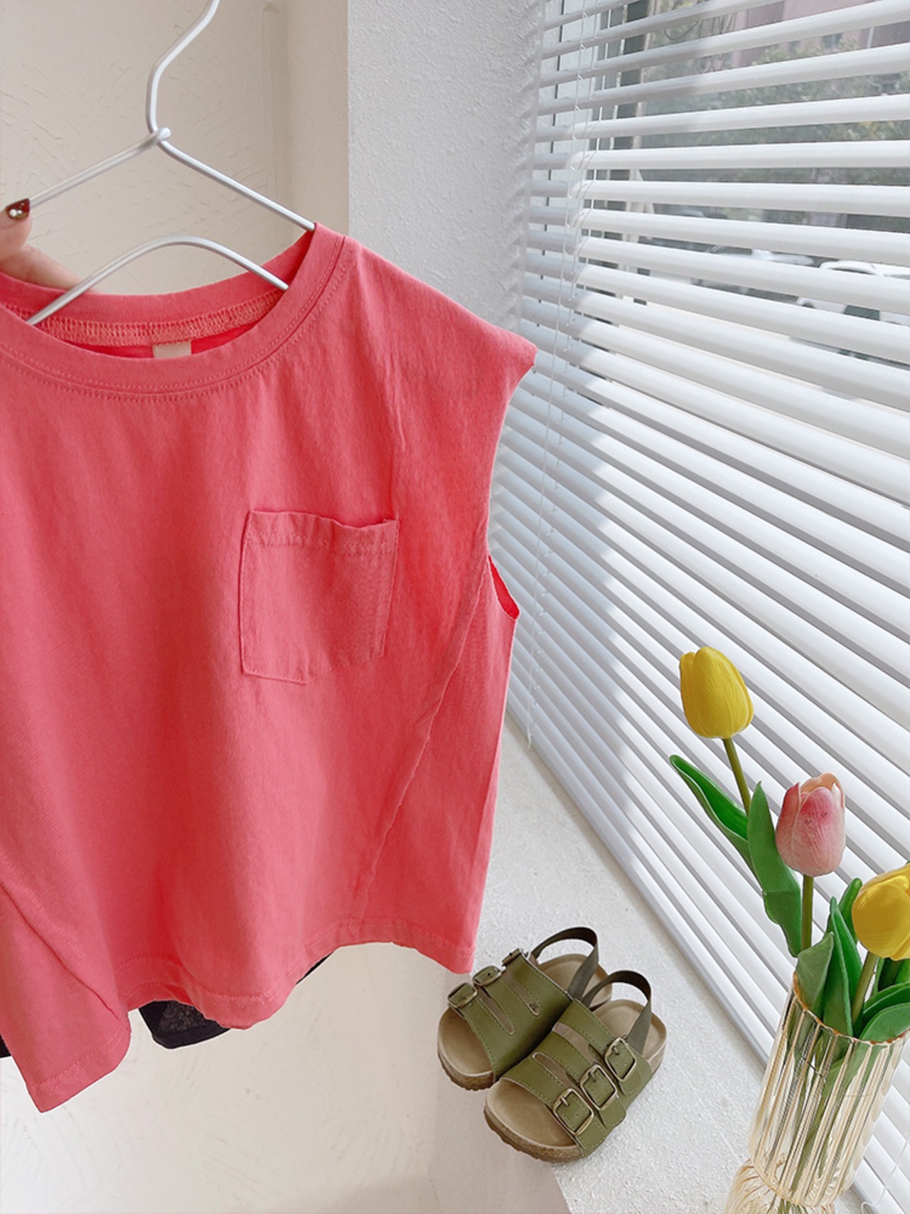 薄手サマーホワイトラウンドネックルーズノースリーブシャツ ポケットトップス コットン 夏物 Oネック mi069563057276