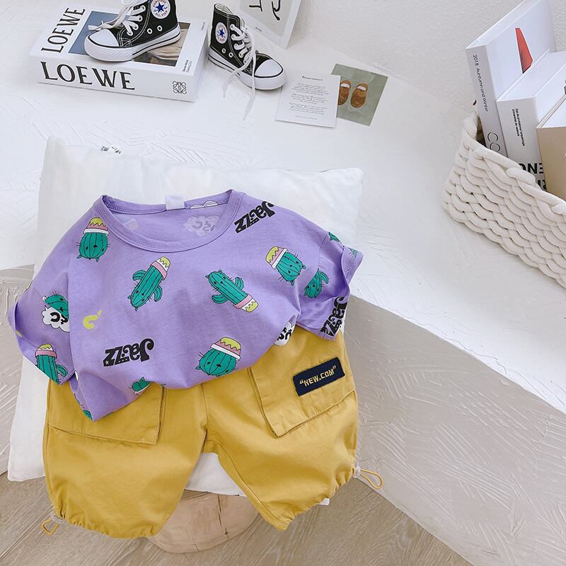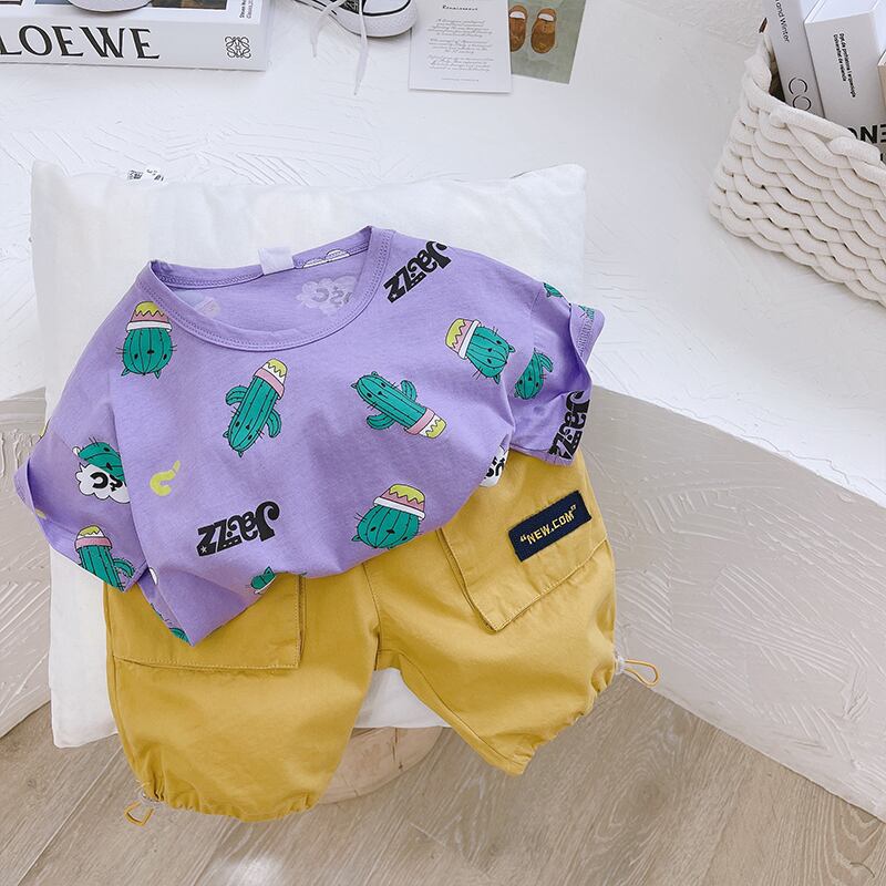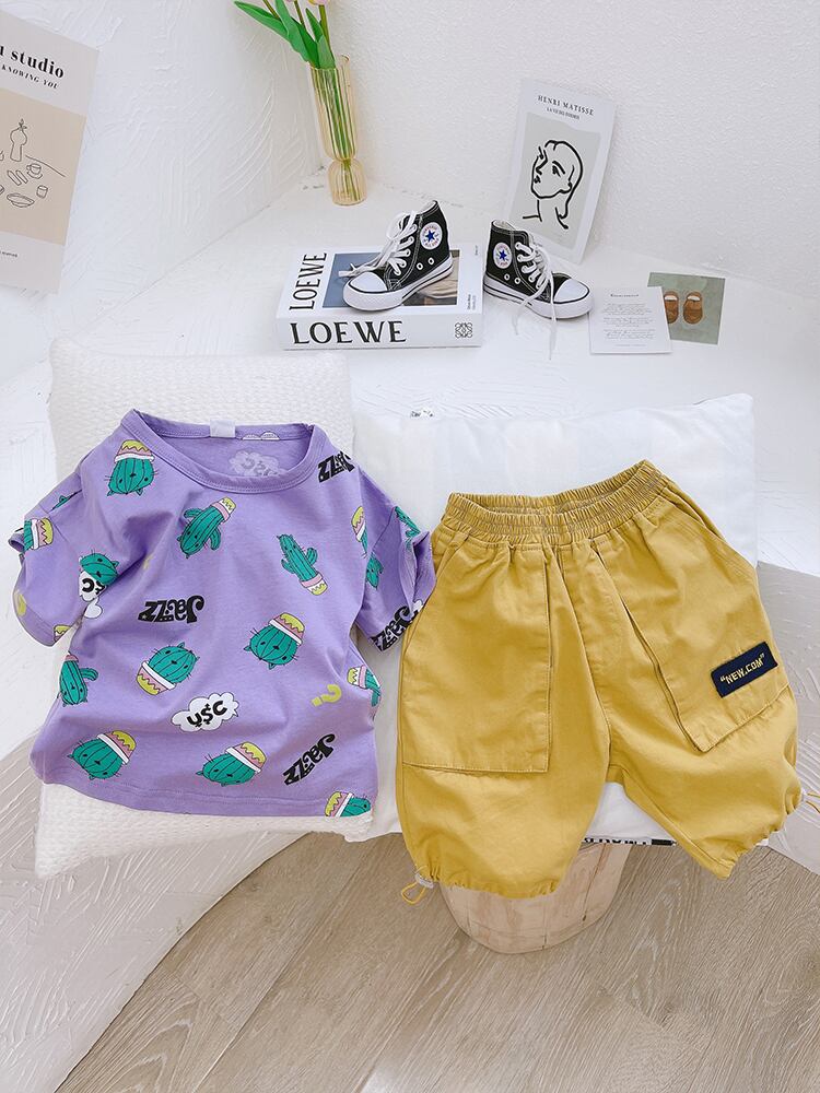 サマーカジュアルプリント柄ラウンドネックイエローショーツ 夏物 ブルマー Oネック パープル mi0655147249112
