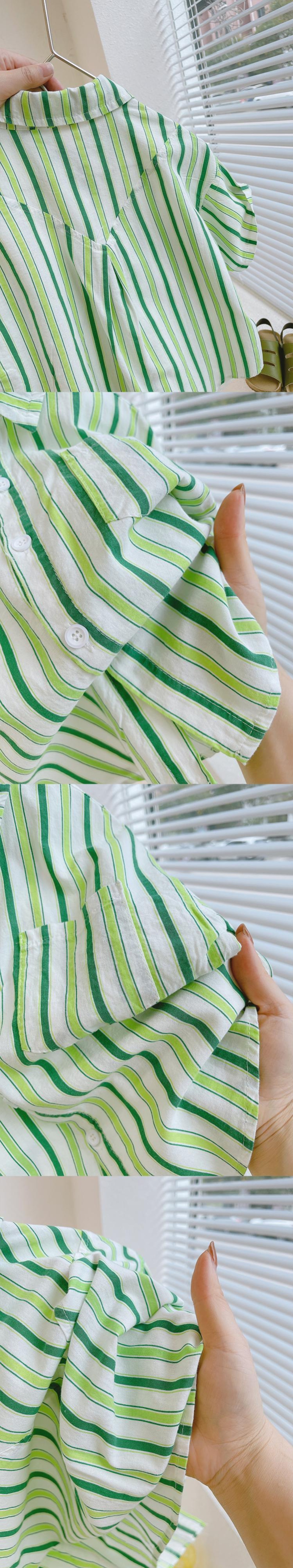 カジュアルスタイルグリーンストライプシャツ ルーズ半袖スリーブカーディガン薄手 ショート ハーフスリーブ mi0679610490951