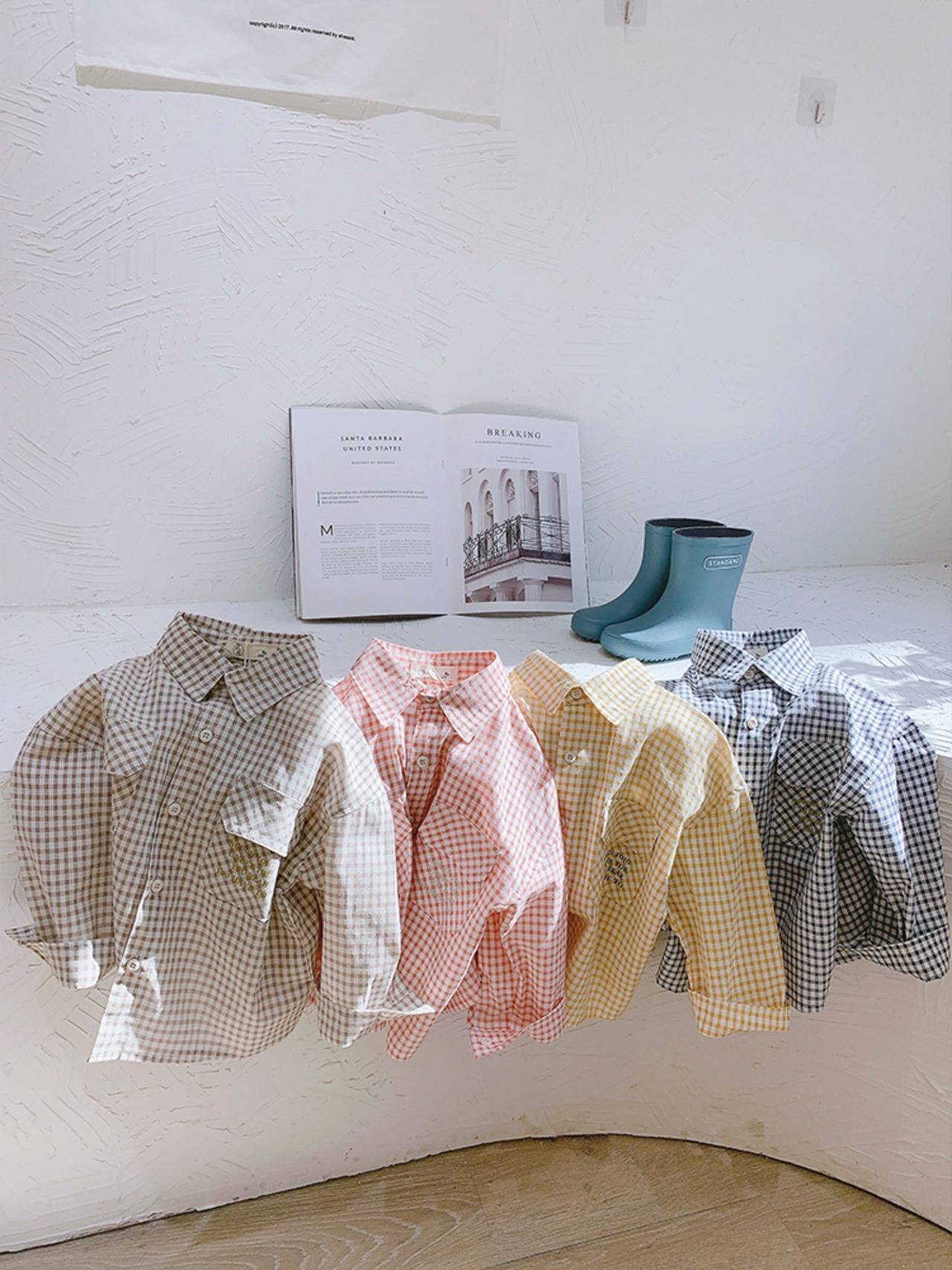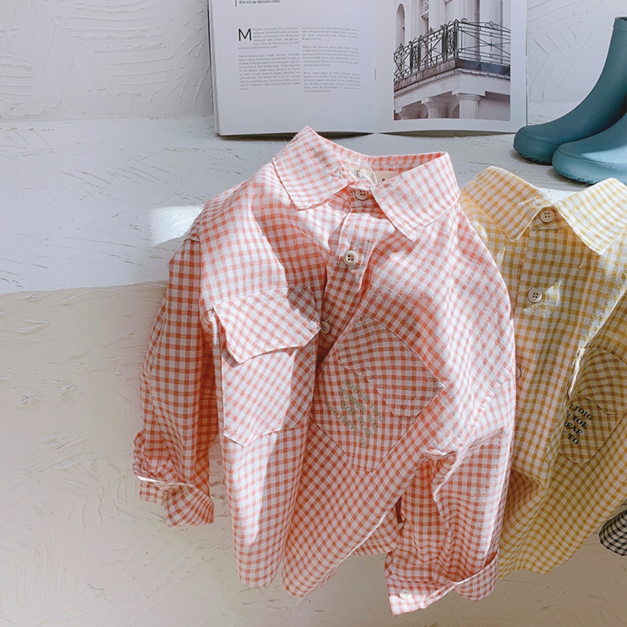 色:黄色のシャツ,青いシャツ,カーキ色のシャツ,オレンジピンクのシャツ