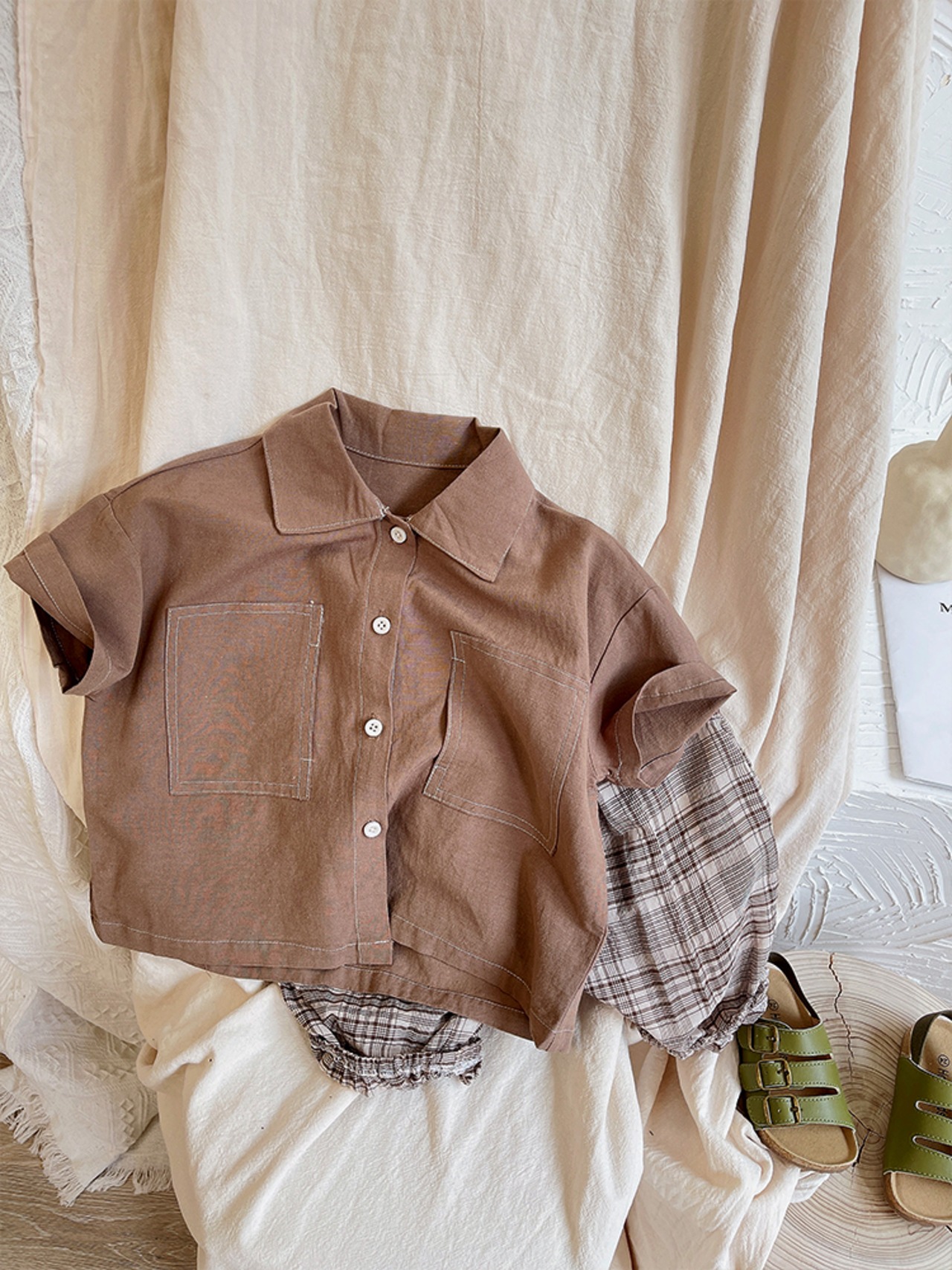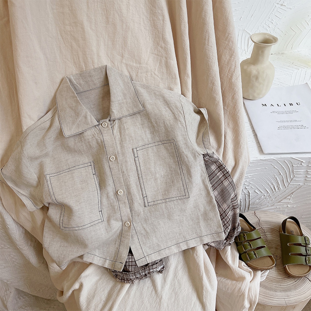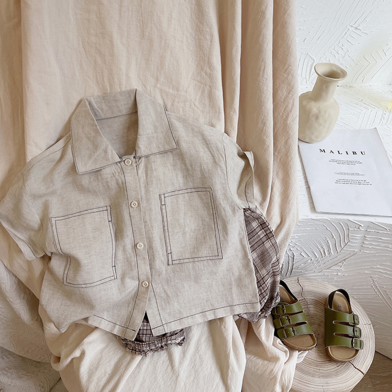 スタンダードシャツ サマー半袖スリーブベージュトップス ショート コットン レトロ ハーフスリーブ 夏物 mi0651243798987