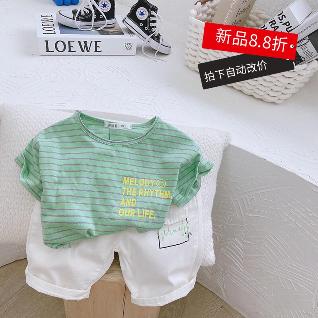 カラーストライプラウンドネック半袖スリーブホワイトカジュアルパンツ ショート ハーフスリーブ Oネック mi0665491201403