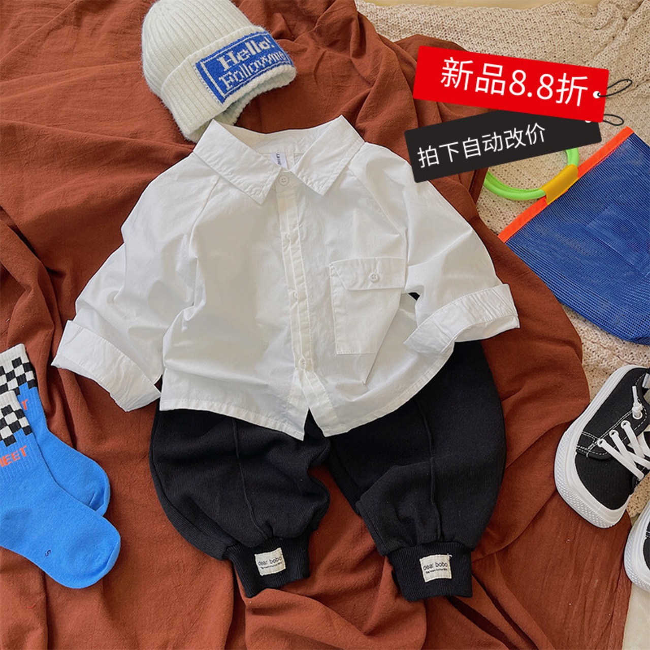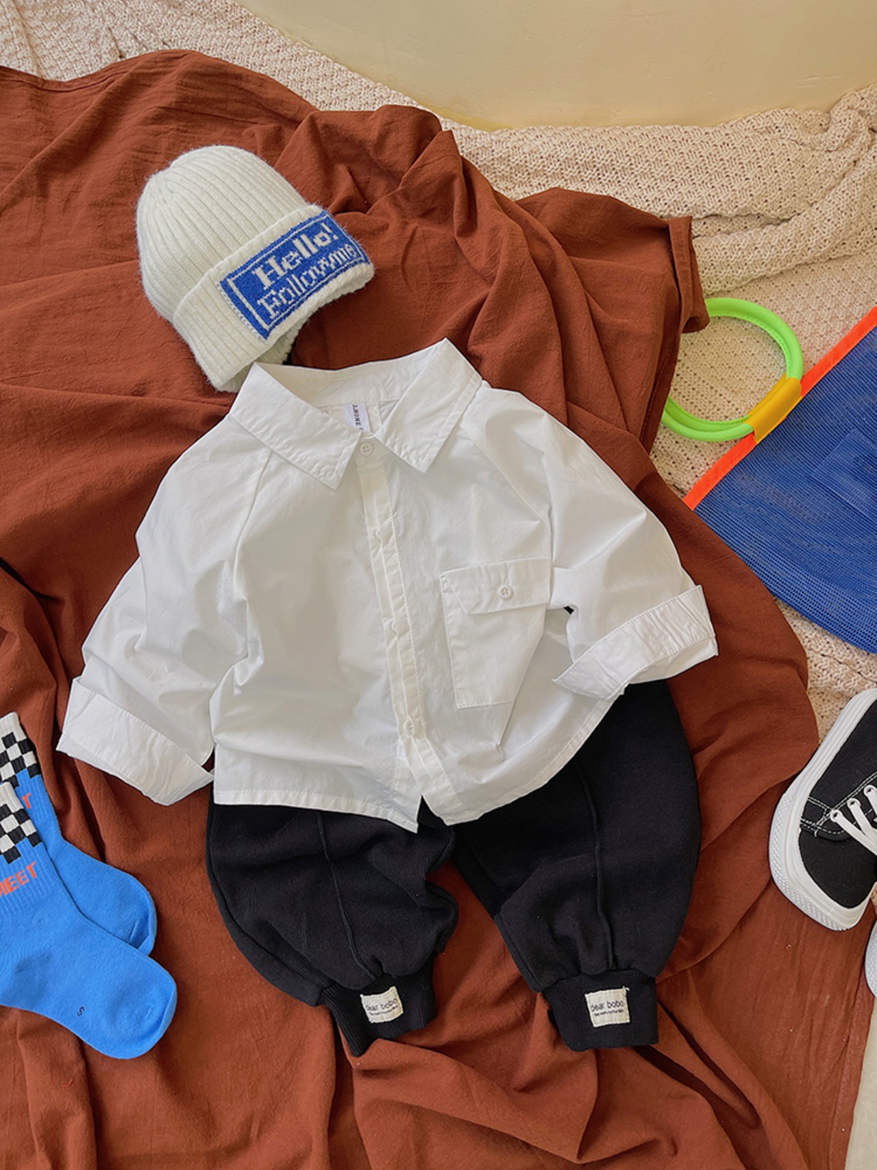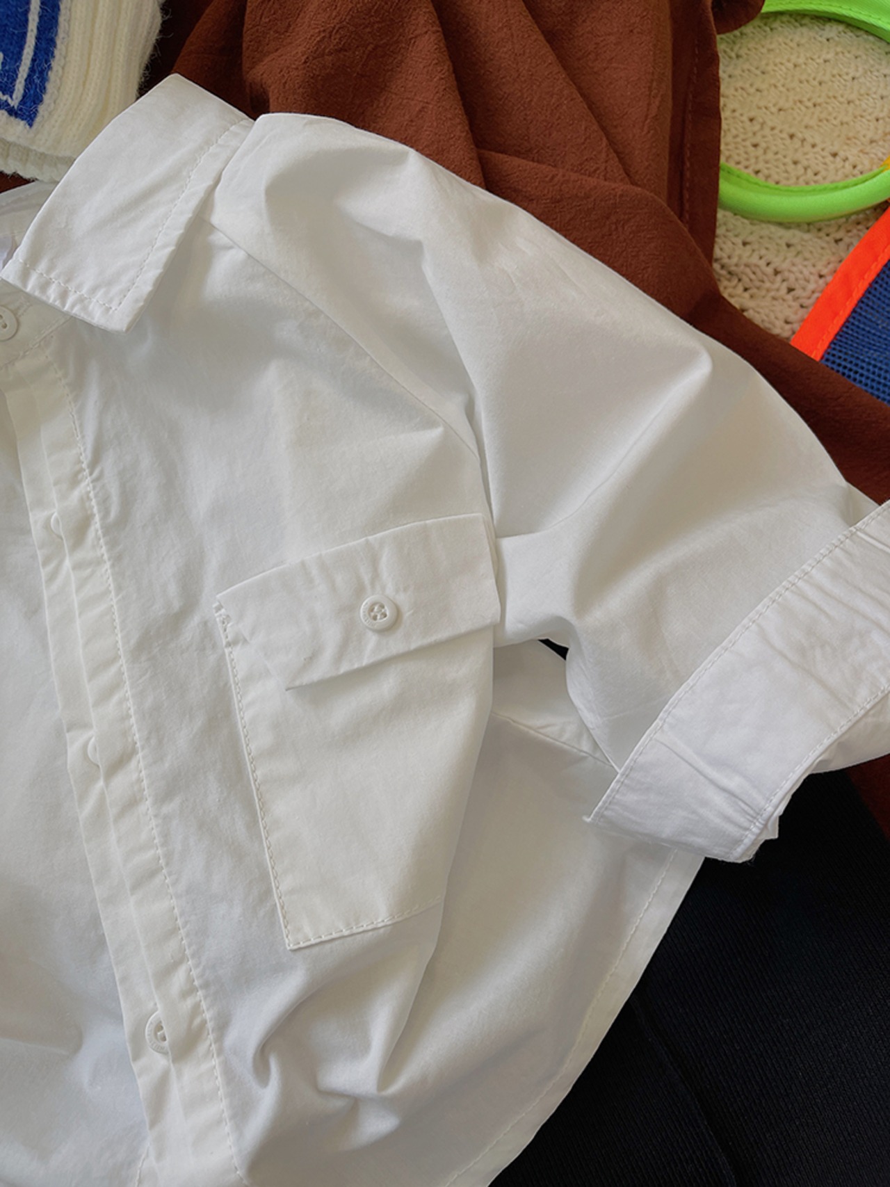スプリングオータムホワイトシャツ カジュアルソリッド カラースリーブポケットトップス コットン 春物 秋物 ソリッドカラー 8/3 mi0677309963494