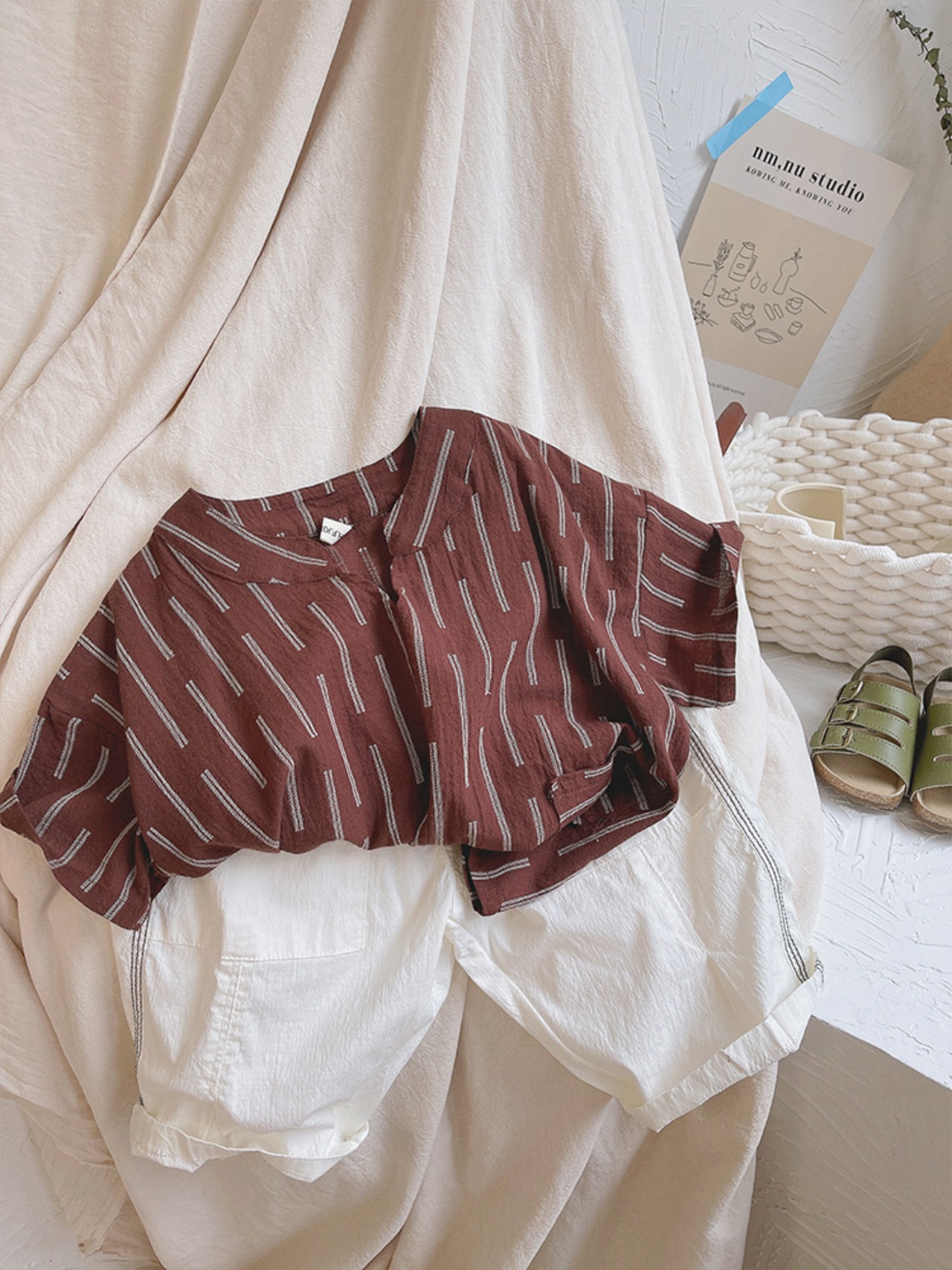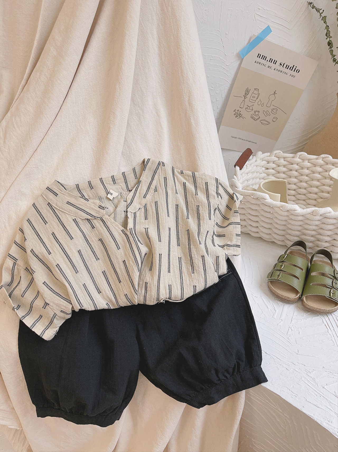 スタンダードスタイルサマーストライプトップス ルーズカラーTシャツ プルオーバー 薄手 コットン レトロ 夏物 4/12 春夏 SS 子供服 韓国風 mi0614326924109