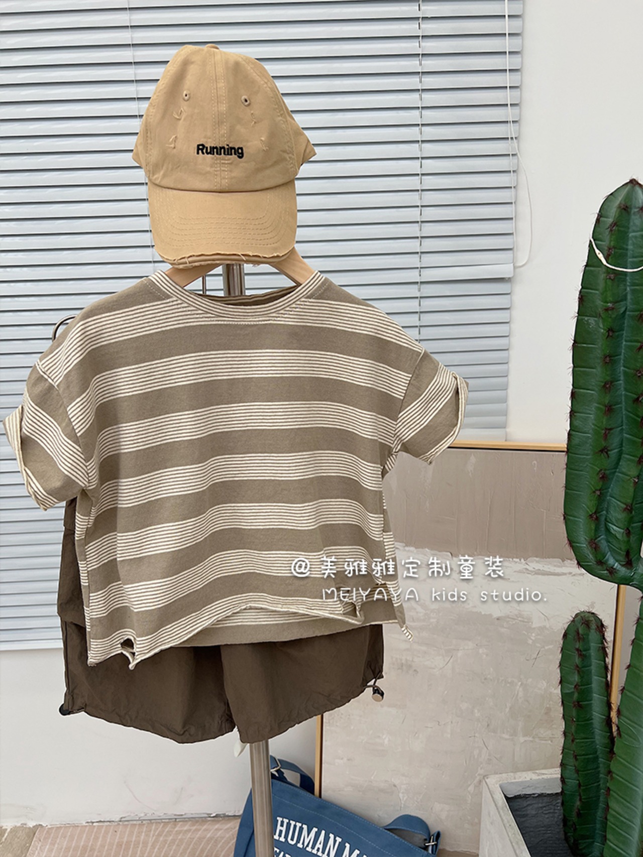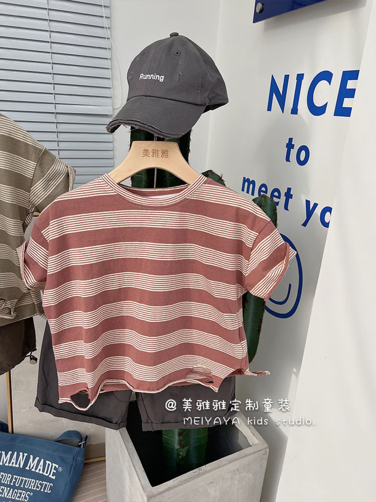 ルーズストライプTシャツ レッドトップス コットン 4/12 春夏 SS 子供服 韓国風 mi0666943739493