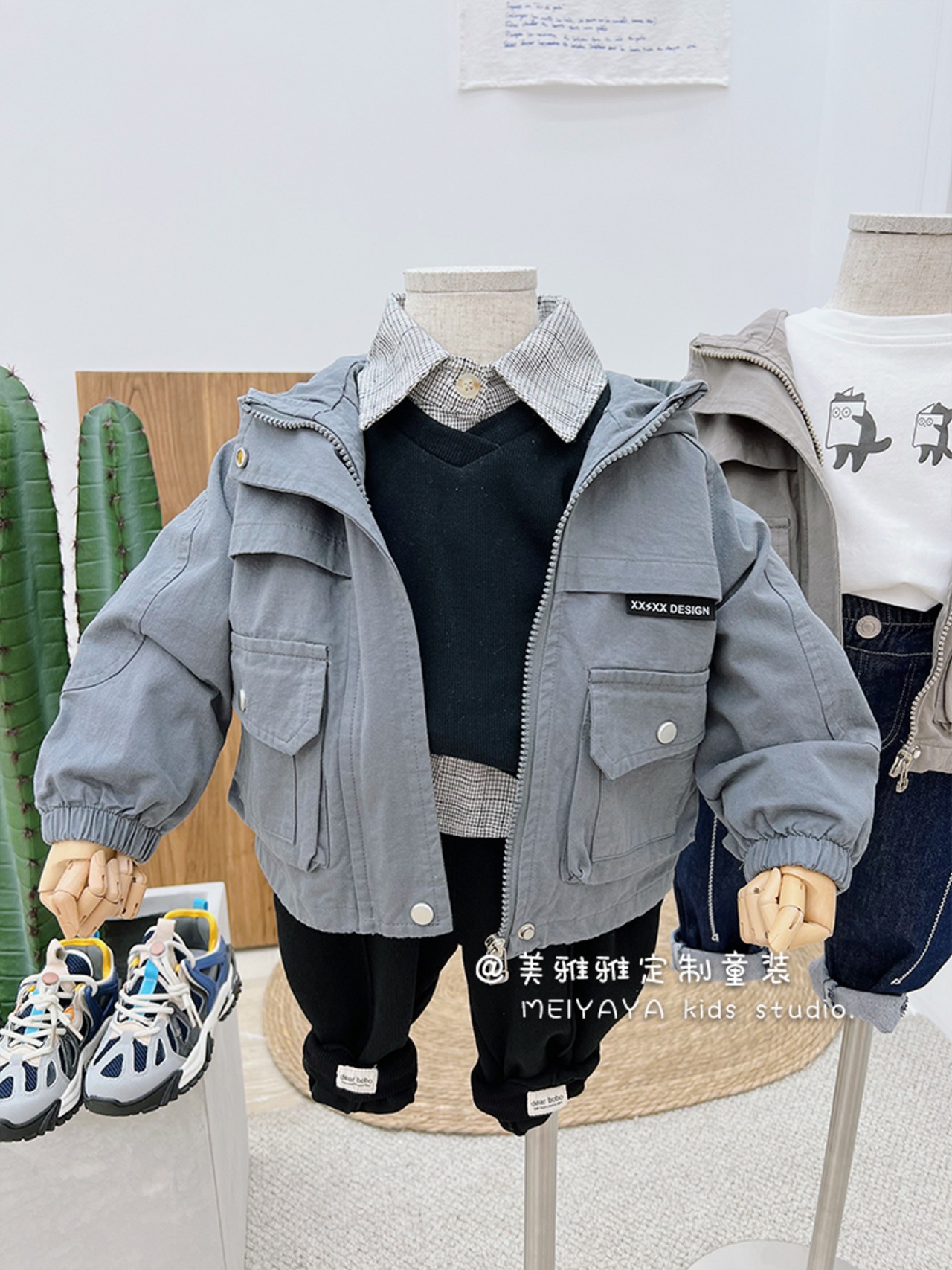スタンダードルーズジッパーフードジャケット ポケットトップス レトロ 4/12 春夏 SS 子供服 韓国風 mi0642419696228