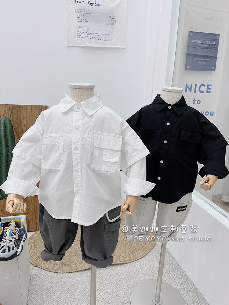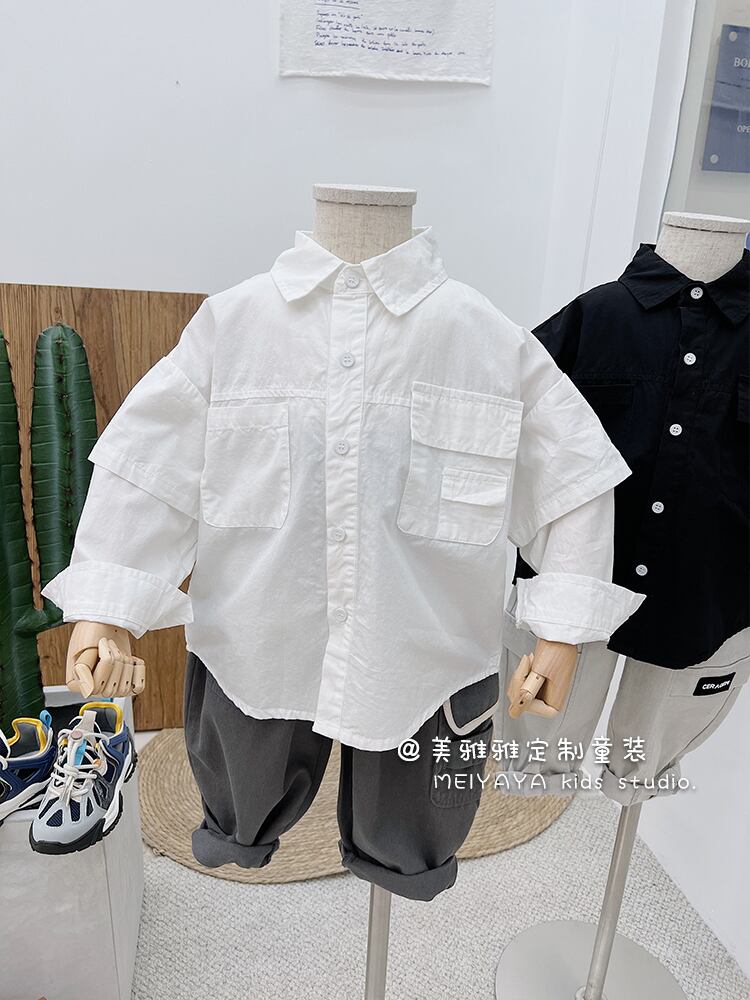 スプリングスリーブホワイトシャツ ポケットソリッド カラーカーディガン コットン 春物 ソリッドカラー 4/12 春夏 SS 子供服 韓国風 mi067553999382