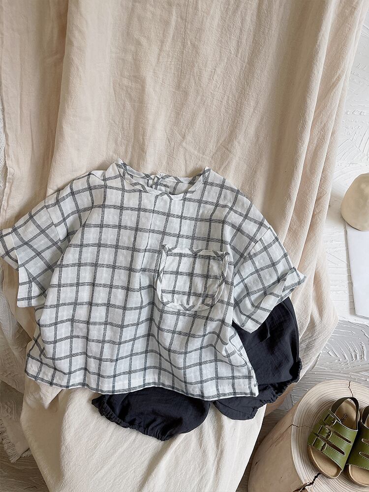 格子柄プルオーバー ルーズポケットトップス ラウンドネックホワイトTシャツ ショート 半袖 ハーフスリーブ Oネック 4/12 春夏 SS 子供服 韓国風 mi0689612455165