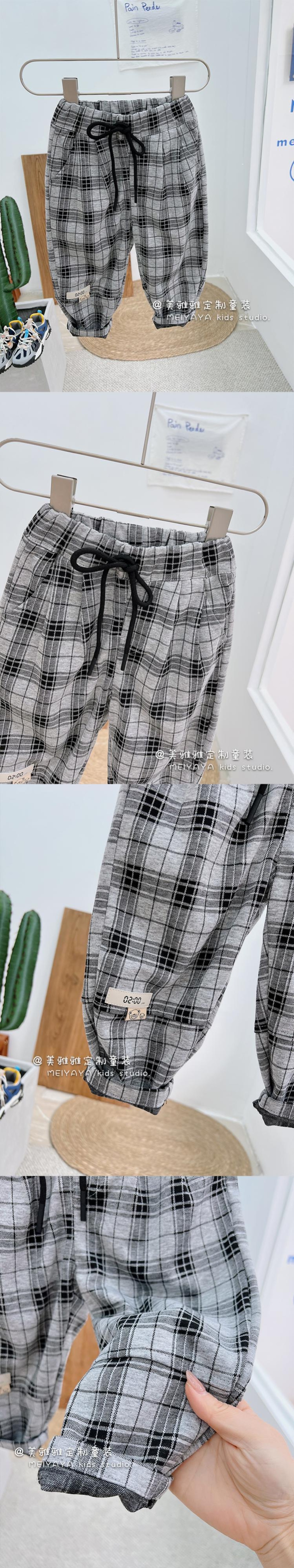 色:ブルーデニムシャツ,赤い文字のシャツ,グレーチェック柄パンツ,白いTシャツ,ブルーパッチパンツ