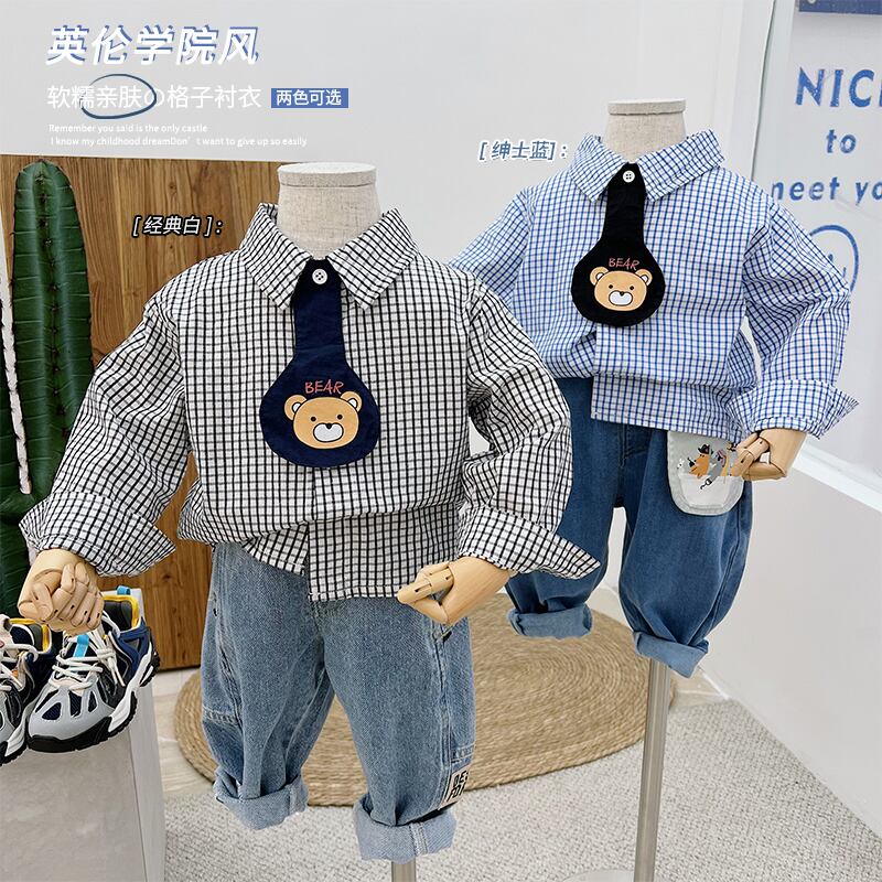 ブルー格子柄シャツ スプリングリボントップス 春物 4/12 春夏 SS 子供服 韓国風 mi0637834785411
